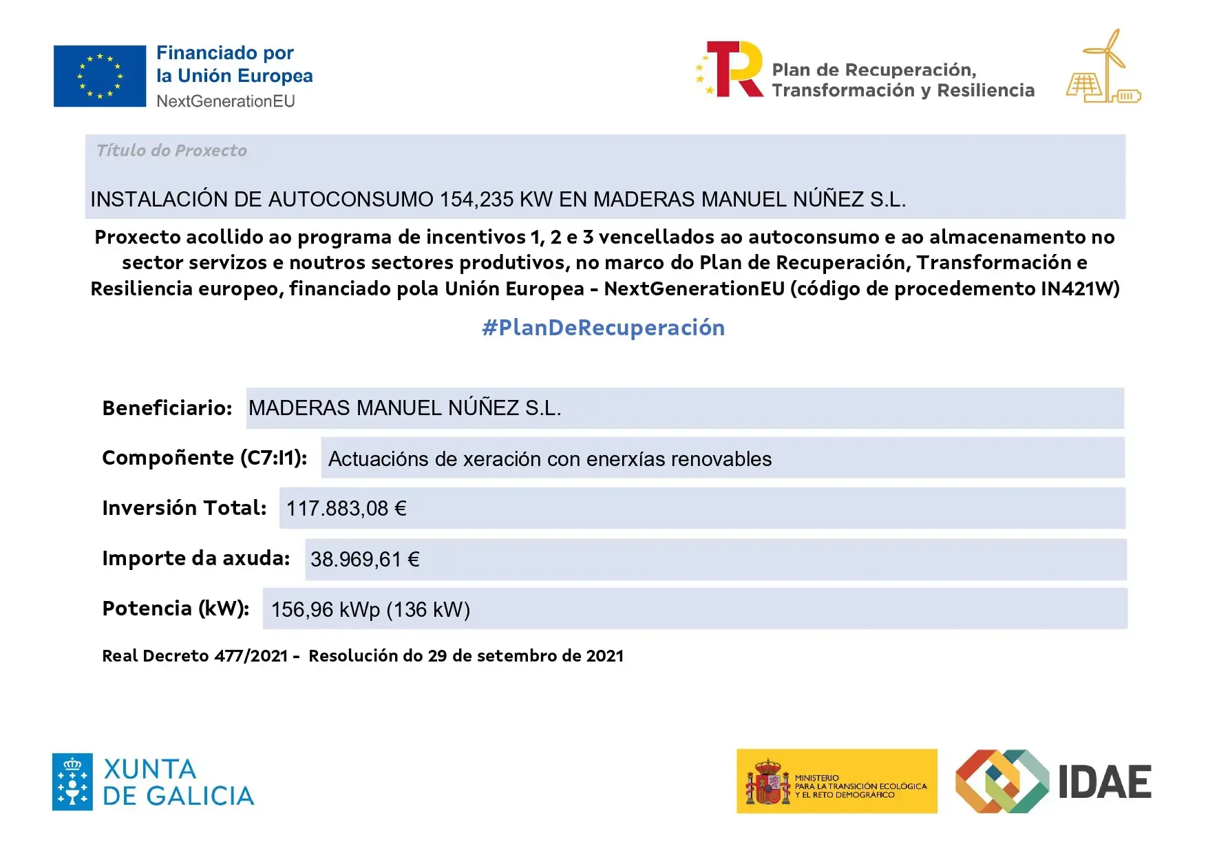 En Maderas Manuel Núñez damos un paso más hacia la sostenibilidad y la eficiencia energética ampliando la capacidad de paneles solares fotovoltaicos en nuestras instalaciones. Este proyecto se ha realizado acogidos a las ayudas del Plan de Recuperación, Transformación y Resiliencia, financiado por la Unión Europea – NextGenerationEU.